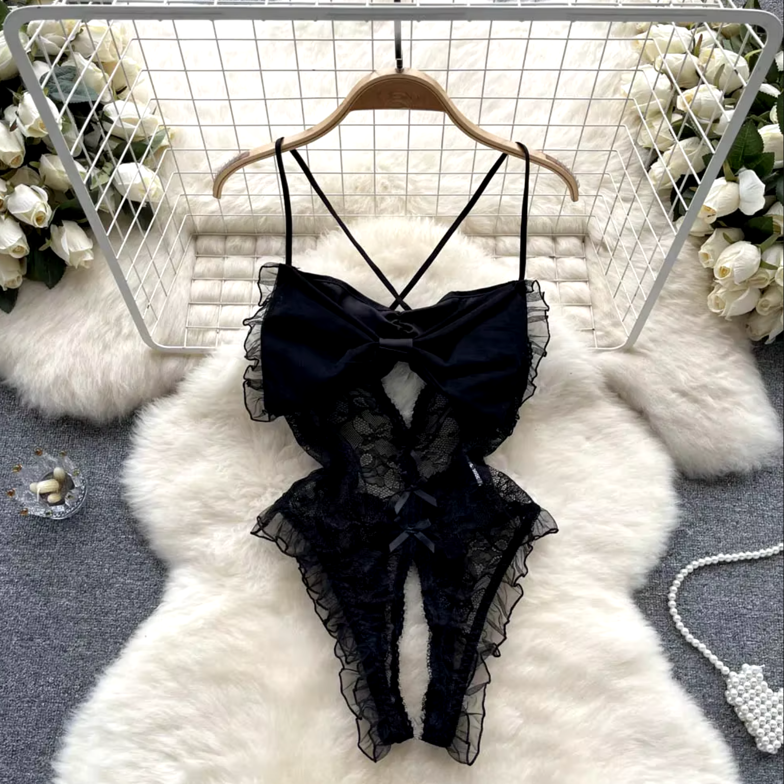 BODY EN DENTELLE AVEC ENTREJAMBE OUVERT ET NŒUD FÉMININ